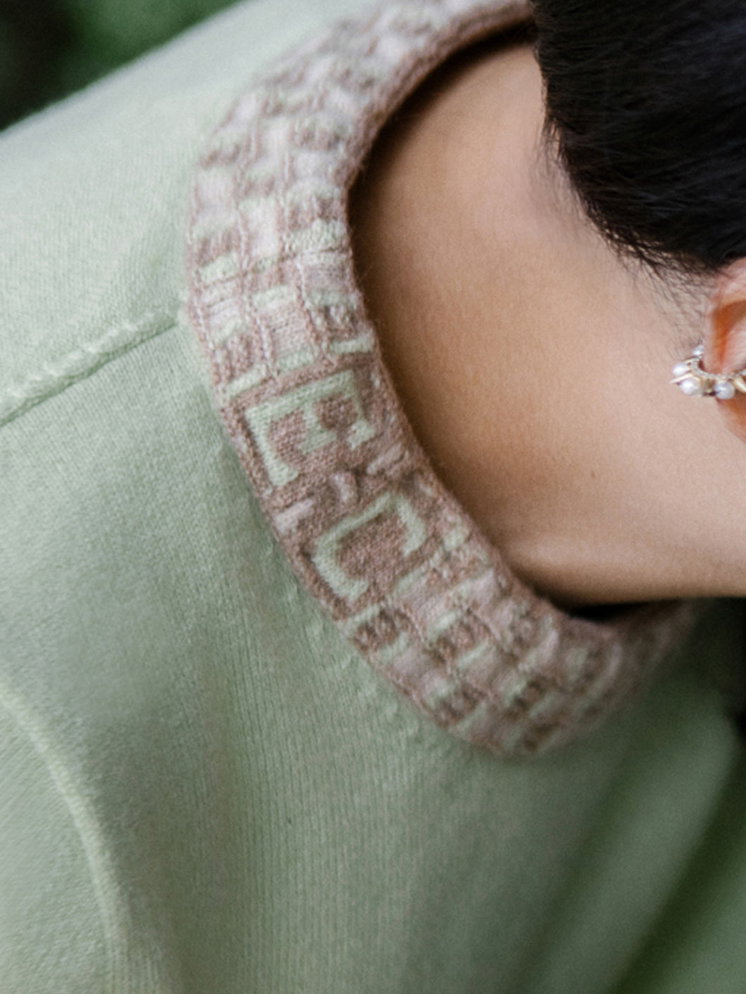 Our sweaters are three-season weight, knitted with 100% virgin cashmere of the finest quality. The weight of yarn is 2/28 nm and the machine we knit it on is 14 gg. It is single jersey with biodegradable lycra plated through the hem to give it a comfortable grip on the waist. The logo is a reverse jersey jacquard. Every aspect of this sweater is knitted and constructed in the same factory in England.